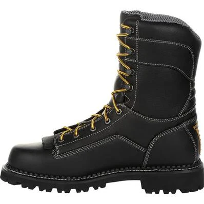 The Georgia Boot AMP LT composite toe waterproof low heel logger combines rugged durability and performance with supreme comfort. The upper is constructed from black full-grain leather and milled brass hardware that extends the life of your laces. The kiltie stops twigs and brush from getting caught up in your laces but can be removed to look more like a traditional work boot. The heel-stabilizing Counter Lock prevents heel slippage and dually acts as a boot kick off.