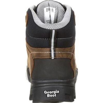 This 5″ hiker style work boot has a full-grain brown leather upper with reflective webbing and a padded collar and tongue. The interior is lined with high performance mesh and comes equipped with the Georgia Waterproof System. The waterproofing system comes with a guarantee to keep your feet dry when worn in wet conditions. Also inside is the Advanced Memory Polyurethane (AMP) insole. It has a polyurethane layer topped with memory foam that will form to your foot providing not only extreme comfort, but a customizable fit as well.