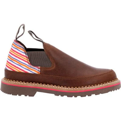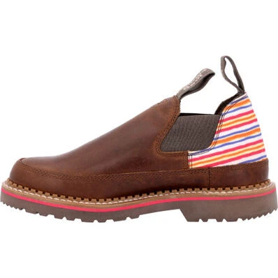 Step out in style with this Georgia Giant striped Romeo! This limited edition Romeo boot features a rich brown leather upper with a bold striped print textile heel. Twin gore panels and nylon pull loops allow for easy pull on of this women’s casual shoe. Inside is a removable memory foam insole for all day cushioned comfort. The oil and slip-resisting polyurethane outsole contains a steel shank for added durability.
