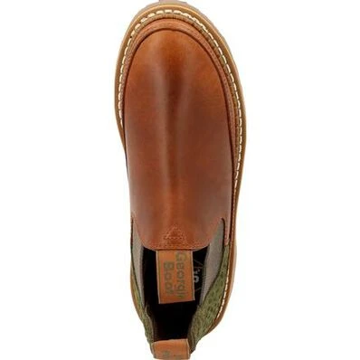 This limited edition women’s Romeo shoe is made with a notched welt construction, featuring a rich brown leather upper with an olive cheetah textile heel. Double gore panels and nylon pull tabs make this an easy pull on shoe.