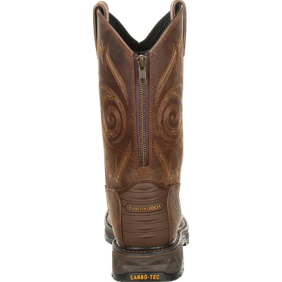 A western look with a work application. The Georgia Boot Carbo-Tec LT composite toe waterproof wellington features a subtle western stitched leather upper with a tough as nails outsole. Leather pull loops, a heel-stabilizing Counter Lock system and a rear zipper and gusset combo provide the ultimate easy-on, easy-off experience for this western work boot. Equipped with an Ergo-Fit composite toe cap, this round toe western work boot meets the ASTM F2413 protective toe and electrical hazard standards for footwear.The inside of this pull on work boot is lined in high performance mesh and is armed with the Georgia Waterproof System, guaranteed to keep your feet dry against water and muck when working in wet conditions. Also found inside is a removable Quick Response polyurethane insole. It absorbs shock as you walk and bounces back to its original form for all day support and comfort.The Carbo-Tec LT outsole is built for ultimate durability and keeps this boot incredibly lightweight. It is comprised of a thick cushioning EVA midsole, a fiberglass shank for added support, and a rubber outsole. The outsole is slip, oil, and abrasion resistant, as well as heat resistant up to 315 °C/600 °F.
