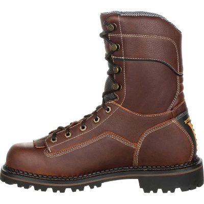 The 9″ AMP LT low heel logger is a fresh look on a classic silhouette packed with extreme comfort.The upper is constructed from soft, full-grain SPR leather and features Easy On grip panels to make pull on a breeze. The brush guard kiltie can be removed for a more traditional work boot look. Equipped with milled brass hardware, a heel-stabilizing Counter Lock system and a Goodyear welt construction, this boot is built for durability.Inside this low heel logger you will find the AMP LT insole. This removable footbed is a layer of cushioning polyurethane topped with a layer of memory foam. It molds to the shape of your foot as you move and cradles your foot in comfort. Additionally inside is the Georgia Waterproof System. This waterproofing is backed with a guarantee to keep your feet dry when wearing in wet conditions.A rugged boot needs a rugged outsole. The AMP LT logger has an EVA midsole, an oil and slip resistant rubber lug outsole and a double ribbed steel shank for added support. This soft toe low heel logger boot meets ASTM F2892 electrical hazard standards for soft toe protective footwear.