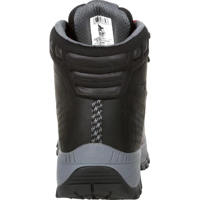 Go from work to trail in the men’s Georgia Boot Eagle Trail waterproof work boot. Built with a cement construction, this plain toe waterproof hiker style work boot is incredibly lightweight and flexible with tons of comfort features.This 6-inch work boot features a black and grey full-grain leather upper, dual functioning hardware, and a molded collar for added comfort. It comes with two pairs of shoe laces in red and black.Equipped with the Georgia Waterproof System, this work boot is guaranteed to keep water and muck out when working in wet conditions. The interior lined with a soft mesh material, while feet rest upon a removable AMP LT memory foam insole. A fiberglass shank, cushioning EVA midsole, and Carbo-Tec Rubber outsole make up the foundation of this boot. The outsole features a multi-directional grip tread pattern and is heat, chemical, abrasion, oil and slip resisting. This hiker work boot meets ASTM F2892 electrical hazard standards for soft toe safety footwear.